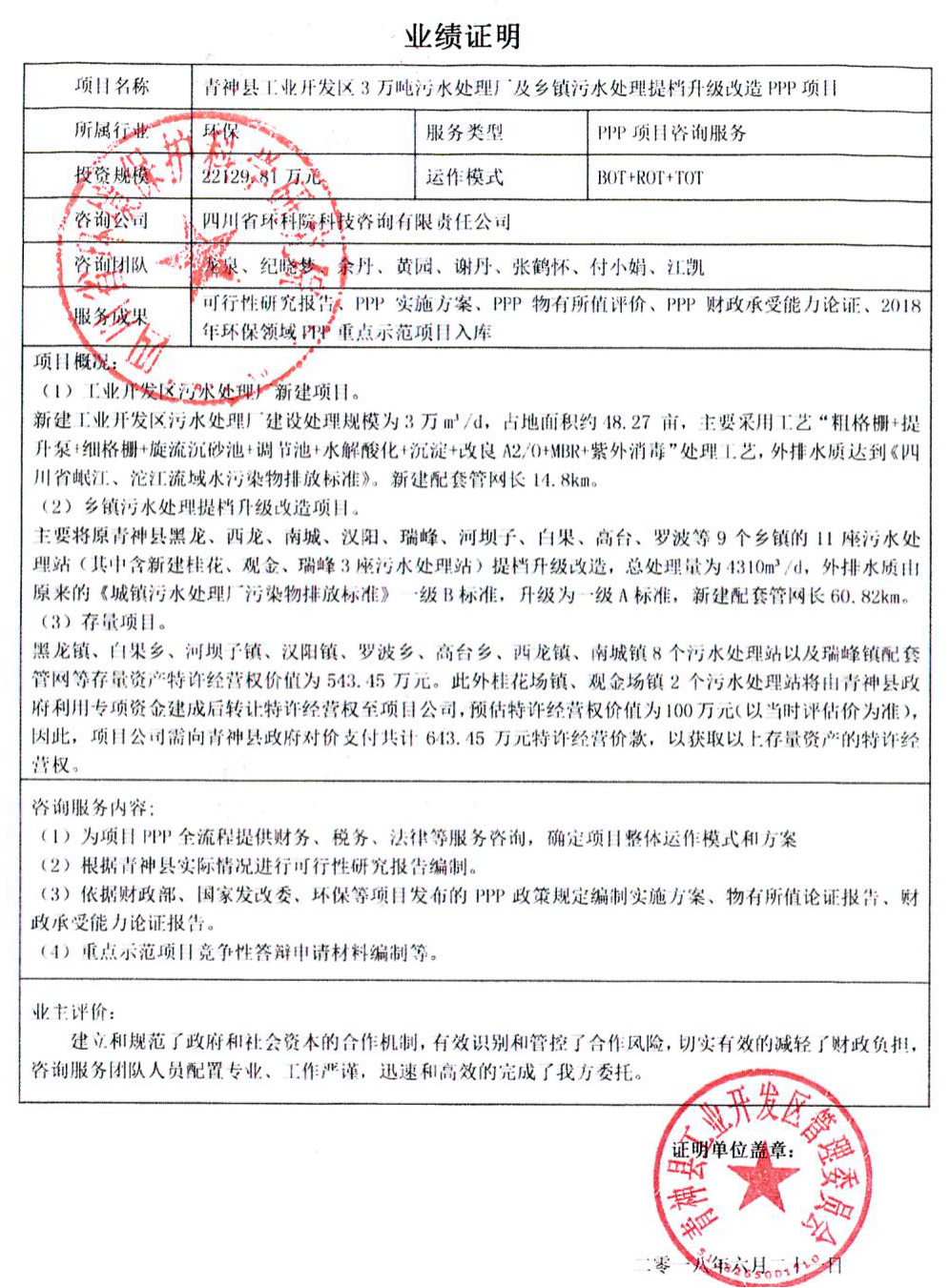 主要成果:該項(xiàng)目為2018年度環(huán)保領(lǐng)域政府與社會資本合作重點(diǎn)示范項(xiàng)目。經(jīng)四川省環(huán)境保護(hù)廳、四川省財政廳組織專家的評審,順利入選四川省PPP項(xiàng)目庫及中央PPP項(xiàng)目競爭立項(xiàng)項(xiàng)目庫,同時進(jìn)入地方政府爭取環(huán)保項(xiàng)目獎補(bǔ)公示名單